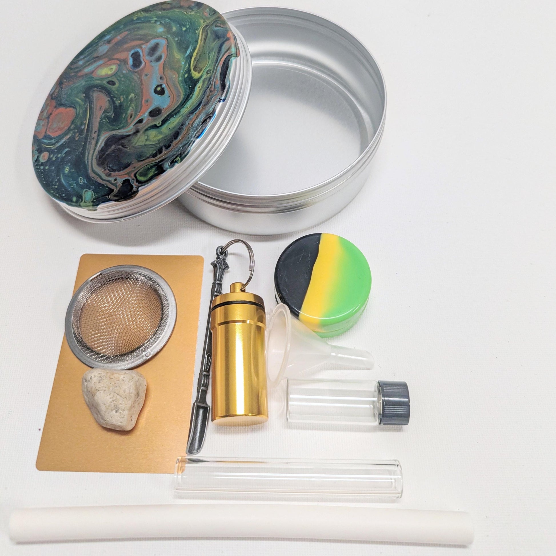 Everything you need to party on the go for your snuff or cacao. Take a toot! Kit contains one sieve and rock, funnel, one large round silicone container, one vial, one large pill container with attached shovel, one metal card, one glass straw, and one long silicone straw. The inside of the screw tight lid is coated with cut resistant epoxy resin.